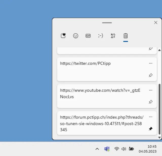 Quelle: PCtipp.chEintrag behalten: Markieren und kopieren Sie den gewünschten Text. Wenn Sie jetzt Windowstaste+V drücken, erscheint dieser (allenfalls nebst anderen kopierten Elementen) in der Zwischenablage aufgelistet. Mit einem Klick darauf könnten Sie ihn im aktuellen Dokument einfügen. Beim PC-Neustart räumt Windows diese zwischengespeicherten Elemente weg. Ist eines dabei, das Sie häufig brauchen und darum behalten möchten?