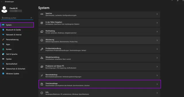 In den Einstellungen gehts zu System und Zwischenablage