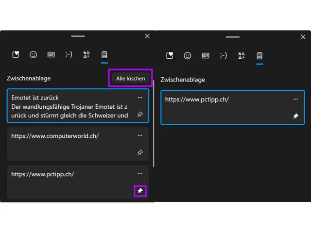 - Nun verschwinden sämtliche Elemente aus der Zwischenablage, ausser jenen, die Sie zuvor angepinnt haben.