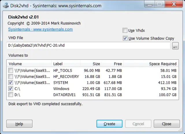 Quelle: pctipp.chEs empfiehlt sich, nun möglichst alle Programme zu schliessen. Klicken Sie auf Create und lassen Sie Disk2VHD den Job erledigen. Das dauert eine Weile. Das Programm meldet unscheinbar «Disk export to VHD completed successfully».