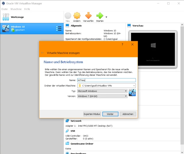 Installieren Sie auf dem neuen Windows-10-PC Oracle VirtualBox, welches für Privatgebrauch ebenfalls kostenlos ist. Gehen Sie auf dieser Webseite zu «VirtualBox 6.1.2 platform packages» und verwenden Sie den Download «Windows hosts», falls Sie Ihr Windows 7 auf einem Windows-10-Rechner laufen lassen wollen.Starten Sie VirtualBox. Gehen Sie zu Neu. Tippen Sie einen kurzen Namen ein, z.B. W7neu. Übernehmen Sie den Speicherort und achten Sie darauf, dass bei Typ und Version die korrekten Infos ausgewählt sind, z.B. Microsoft Windows und Windows 7 (64 bit). Klicken Sie auf Weiter.