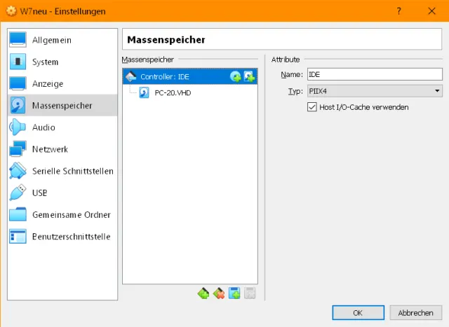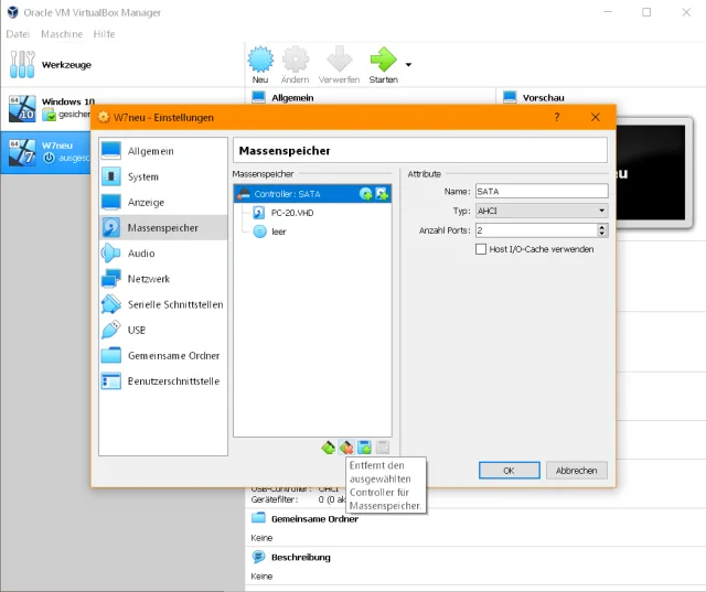 Starten Sie die virtuelle Maschine, indem Sie oben auf den grünen Starten-Pfeil klicken.Bluescreen? Keine Panik, wenn jetzt ein Bluescreen mit dem Fehlercode «0x0000007B» erscheint. Schliessen Sie in diesem Fall die virtuelle Maschine übers kleine X in der oberen rechten Fenster-Ecke und bestätigen Sie die Rückfrage. Die Maus können Sie über die rechte Ctrl-Taste befreien, falls sie im Fenster gefangen ist. Nun gehts zu Ändern/Massenspeicher. Klicken Sie oben auf den SATA-Controller und entfernen Sie ihn.