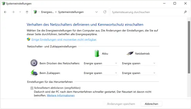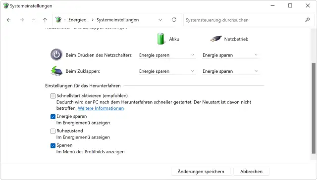 Deaktivieren Sie den Schnellstart und klicken Sie auf Änderungen speichern.