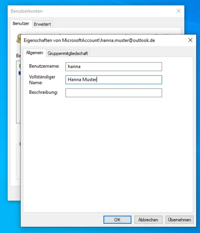 Hat es nicht genützt? Wenn das noch nicht zum Erfolg geführt hat, dann helfen Sie noch etwas nach. Klicken Sie auf Start und tippen Sie netplwiz ein. Führen Sie es aus und bestätigen Sie allenfalls die Administrator-Rechte. Klicken Sie den betroffenen Nutzernamen an und verwenden Sie Eigenschaften. Tippen Sie im Feld Voller Name Ihren Namen ein. Klicken Sie in den beiden geöffneten Fenstern auf OK und starten Sie den PC neu.