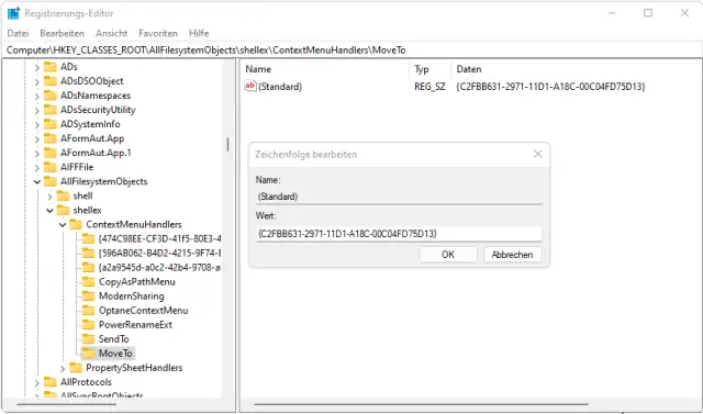 Klicken Sie mit Rechts auf ContextMenuHandlers, gefolgt von Neu/Schlüssel. Nennen Sie den ersten Schlüssel MoveTo. Klicken Sie den neuen Schlüssel MoveTo an und werfen Sie einen Blick in die rechte Fensterhälfte. Dort finden Sie einen Eintrag (Standard). Doppelklicken Sie ihn und verpassen Sie ihm diesen Wert, inkl. der geschweiften Klammern: