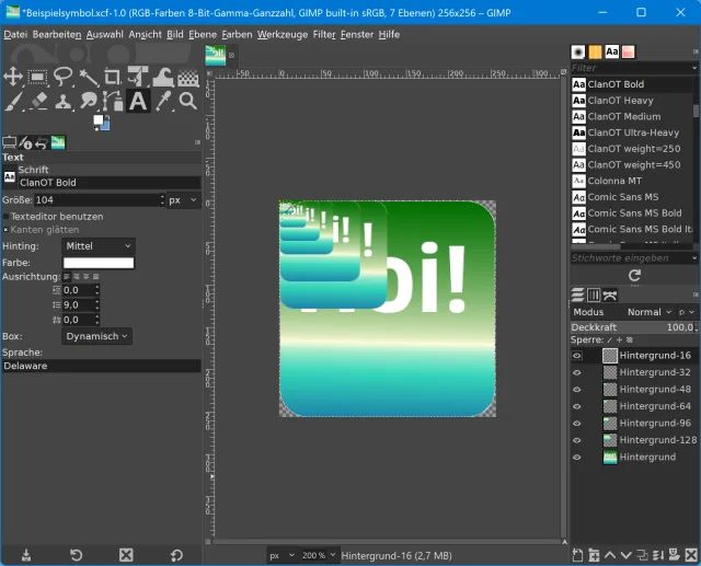 Erstellen Sie in GIMP ein 256×256 Pixel grosses Symbol in einer ersten Hintergrundebene. Duplizieren Sie diese Ebene sechsmal (Versatz: 0) und verpassen Sie den restlichen Ebenen die weiteren Icon-Grössen: