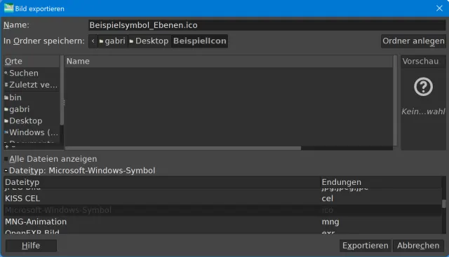 Jetzt gehts zum Speichern als Icon-File: Gehen Sie zu Datei/Exportieren nach. Klappen Sie unten links Dateityp auf und wählen Sie Microsoft-Windows-Symbol.