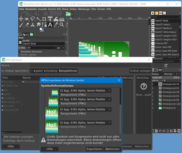 GIMP exportiert die Ebenen in eine .ico-Datei, die mehrere Darstellungsgrössen enthält