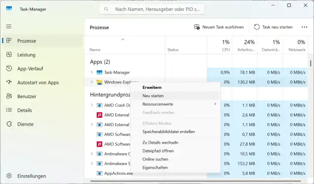 Klicken Sie im Anschluss in Windows mit der rechten Maustaste auf Start und wählen Sie Task-Manager aus. Windows-11-Nutzer suchen auf dem Reiter Prozesse nach dem Eintrag Windows-Explorer und klicken mit der rechten Maustaste darauf. Wählen Sie Neu starten aus, Bild 10.