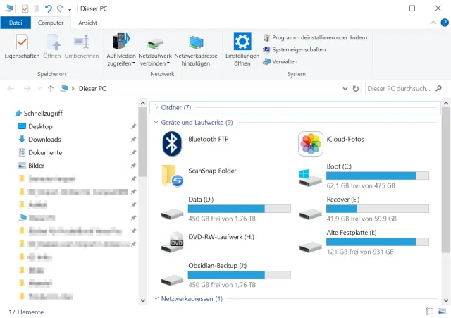 Bild 3: Die Ansicht Dieser PC zeigt eingebundene Laufwerke, Partitionen und Standardordner sowie links den Schnellzugriff