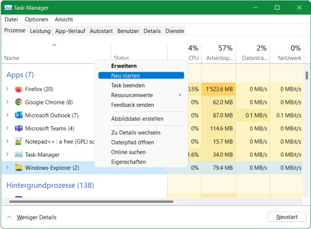 Ein Rechtsklick auf den Prozess «Windows-Explorer» erlaubt es, ihn separat neu zu starten