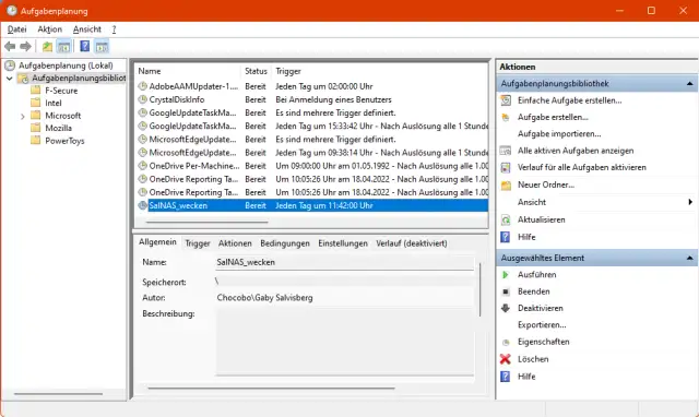 Öffnen Sie via Start und Eintippen von Aufgaben die Aufgabenplanung. Klicken Sie auf Aufgabenplanungsbibliothek. Die manuell erfassten Aufgaben befinden sich meistens direkt im Hauptordner der Bibliothek. Falls Sie eine andere suchen, durchforsten Sie die Unterordner. Finden Sie hier heraus, wie die Aufgabe genau heisst. Bei mir heisst sie SalNAS_wecken.