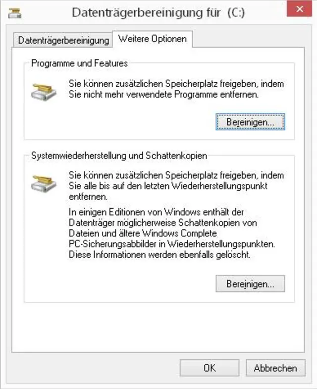 Quelle: PCtipp.chAller guten Dinge sind drei, falls die Luft auf dem Laufwerk immer noch knapp ist: Gehen Sie noch einmal zu den Eigenschaften des Laufwerks C:, klicken wieder auf Bereinigen/Systemdateien bereinigen. Wechseln Sie jetzt aber zum Reiter Weitere Optionen. Diese beiden Bereinigungshilfen bringen richtig viel freien Platz. Bei der ersten müssen Sie selbst entscheiden, welche Programme Sie nicht mehr brauchen. Beim Entfernen der Wiederherstellungspunkte müssen Sie sich zudem bewusst sein, dass Sie damit auch Wiederherstellungsmöglichkeiten von Dateien und des Systemzustands verlieren könnten. Wenn Sie ohnehin regelmässig Ihre Daten sichern, ab und zu ein Systemabbild erstellen und wenn Sie bei grösseren Problemen lieber neu installieren, statt das System zurückzusetzen, dann kann dies aber nützlich sein. Der letzte Wiederherstellungspunkt bleibt jedoch erhalten.