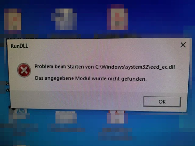 Beim Aufstarten erscheint eine kleine Dialogbox mit dem Titel «RunDLL» und der Meldung: «Problem beim Starten von C:\Windows\system32\eed_ec.dll. Das angegebene Modul wurde nicht gefunden».