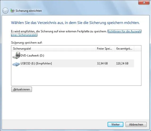 Sicherung einrichten: Klicken Sie unten rechts im Systemtray aufs Fähnchen, um das Popup zum Wartungscenter zu öffnen. Gehen Sie da zu Sicherung einrichten. Achten Sie darauf, dass Ihre Sicherungsplatte angestöpselt ist und benutzen Sie gegebenenfalls die Aktualisieren-Schaltfläche. Klicken Sie aufs Backup-Laufwerk, gefolgt von Weiter. Bei den zu sichernden Daten greifen Sie zu «Auswahl durch Windows». Wenn Sie nur ganz bestimmte Daten und Einstellungen sichern wollen, können Sie diese per «Auswahl durch Benutzer» später gezielt auswählen. Dies empfehlen wir nur fortgeschrittenen Nutzern. Klicken Sie auf Weiter.