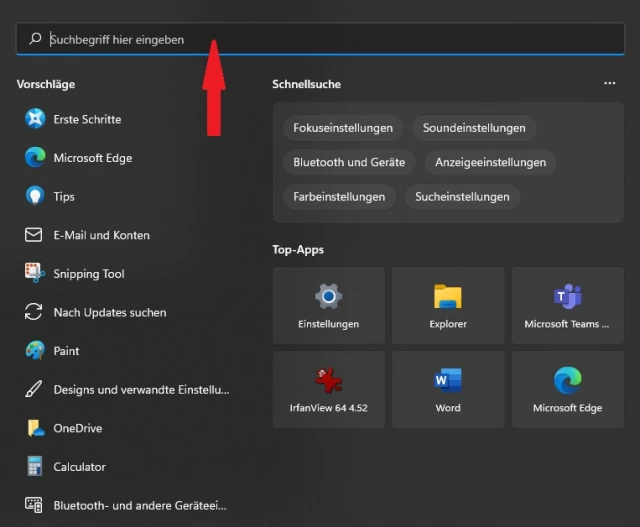 Ein weiteres Suchfeld gibt es im Startmenü. Unter Windows 11 ist dieser Suchbalken sogar am oberen Rand des Startmenüs sichtbar, Bild 5. In Windows 10 ist der Balken unsichtbar, funktioniert aber beim Eintippen trotzdem.