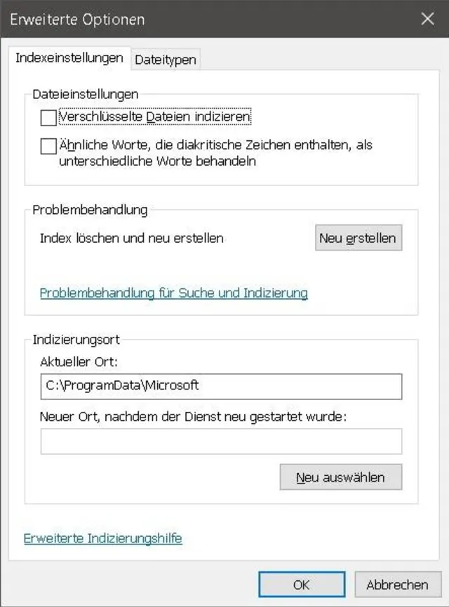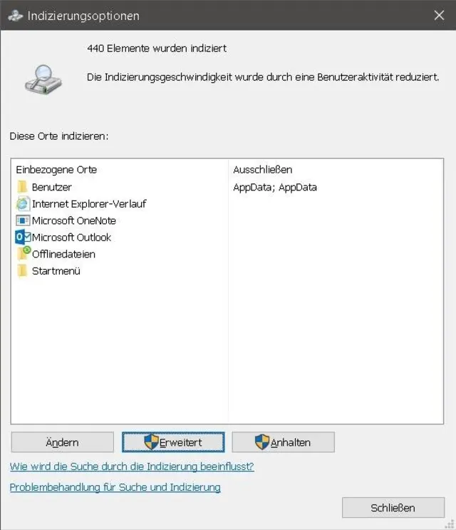 Abhilfe schafft ein manuelles Erneuern des Index. Öffnen Sie die Systemsteuerung; unter Windows 7 durch Klick aufs Startmenü, unter Windows 10 durch Rechtsklick aufs Startmenü, jeweils gefolgt von Systemsteuerung. Tippen Sie im Suchfeld oben rechts indiz ein und öffnen Sie die jetzt angezeigten Indizierungsoptionen. Klicken Sie darin auf Erweitert und im neuen Fenster bei «Problembehandlung» auf Neu erstellen. Bestätigen Sie die Rückfrage.