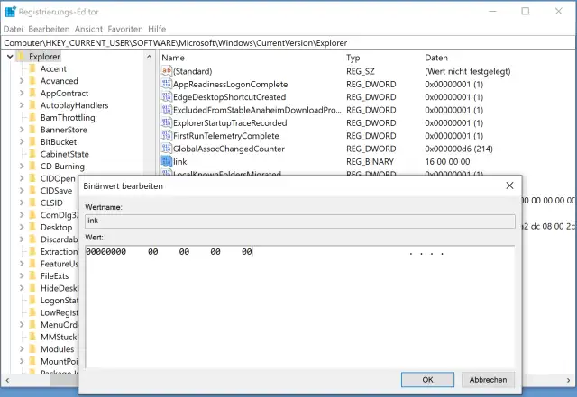 Quelle: PCtipp.chKlicken Sie den Unterzweig «Explorer» an, damit Sie in der rechten Fensterhälfte seine Einträge sehen. Doppelklicken Sie in der rechten Fensterhälfte den Eintrag «link». Leeren Sie dessen Werte mittels Delete-Taste (Lösch) und tippen Sie stattdessen acht Nullen ein (00 00 00 00). Klicken Sie auf OK. Damit die Änderung in Kraft tritt, müssen Sie sich von Windows einmal kurz ab- und wieder anmelden oder Windows einmal neu starten. Oder aber: