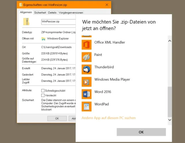 Zuordnung via Bedienoberfläche: Sie können auch versuchen, die Dateizuordnung über die Dateieigenschaften wiederherzustellen. Klicken Sie mit Rechts auf eine Zip-Datei und wählen Sie Eigenschaften. Klicken Sie im Reiter Allgemein auf Ändern. Windows zeigt Ihnen den Öffnen mit-Dialog. Wählen Sie Explorer bzw. (unter Windows 7) Windows-Explorer aus. Falls er dort nicht erscheint, klicken Sie auf Weitere Apps bzw. auf Durchsuchen. Falls in Windows 10 der Explorer noch nicht in der Liste auftaucht, klicken Sie auf Andere App auf diesem PC suchen. Schnappen Sie sich ab dem Laufwerk C:, aus dem Ordner Windows das Programm explorer bzw. explorer.exe.