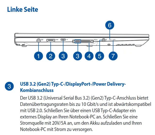 Auch da sollten Sie allerdings den DisplayPort gegenüber HDMI bevorzugen. Finden Sie keinen DisplayPort-Anschluss, obwohl es sich um einen modernen Gaming-Laptop handelt? Vermutlich wird das DisplayPort-Signal über einen der USB-C-Anschlüsse nach aussen geführt. Welcher das ist (manchmal sinds mehrere), erfahren Sie in der Regel aus dem Handbuch, wie zum Beispiel bei diesem Asus-Gerät. Das ist in der Regel auch der Anschluss, an dem Sie eine allfällige Docking-Station anstöpseln. Den Monitor können Sie in diesem Fall auch mit dem Dock verbinden, genau wie Tastatur und Maus. So brauchen Sie in der Regel nur ein Kabel zu trennen, um den Laptop ohne die ganze Peripherie mitzunehmen.