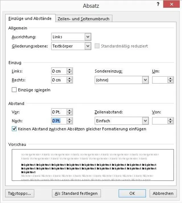 - Abstand vor und nach dem Absatz auf 0 Pt.