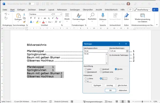 Markieren Sie das Verzeichnis per Maus und kopieren Sie es mit Ctrl+C (Strg+C). Fügen Sie ein, zwei leere Zeilen ein. Klicken Sie mit rechter Maustaste und wählen Sie bei den Symbolen der Einfügeoptionen jenes für Nur den Text übernehmen. Das Verzeichnis erscheint, wenn auch ohne Formatierung (und leider auch ohne klickbare Verknüpfung). Markieren Sie es und öffnen Sie im Reiter Start im Bereich Formatvorlagen das unscheinbare Steuerelement. Greifen Sie zu Tabstopps. Legen Sie mit der Option Rechts einen Tabstopp an derselben Stelle fest, wie Sie ihn für Ihre Seitenzahlen haben wollen, zum Beispiel bei 16 Zentimetern. Aktivieren Sie passende Füllzeichen. Die Punkte machen sich meist recht gut. Klicken Sie auf OK.
