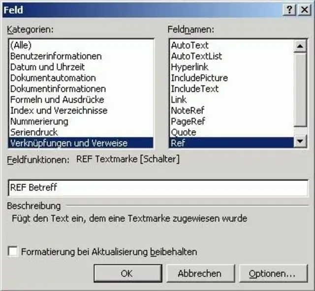 Gehen Sie dazu folgendermassen vor: Wählen Sie "Einfügen/Feld...", und dann die Kategorie "Verknüpfungen und Verweise". Unter "Feldnamen" wählen Sie "Ref" (für Referenz).
