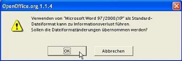 Aufgrund der oben erwähnten Inkompatibilitäten zwischen Word und OpenOffice.org werden Sie jedoch sicherheitshalber bei der Bestätigung dieser Änderung noch einmal darauf hingewiesen, dass nicht alles Eins zu Eins gespeichert werden kann. Quittieren Sie diesen Hinweis mit "OK", dann ist die Änderung vorgenommen.