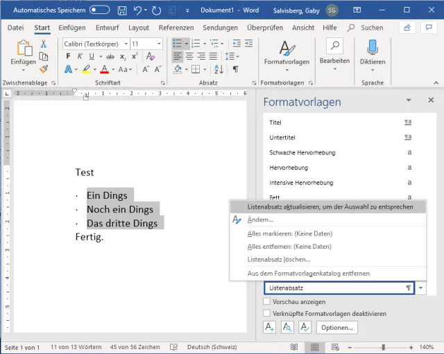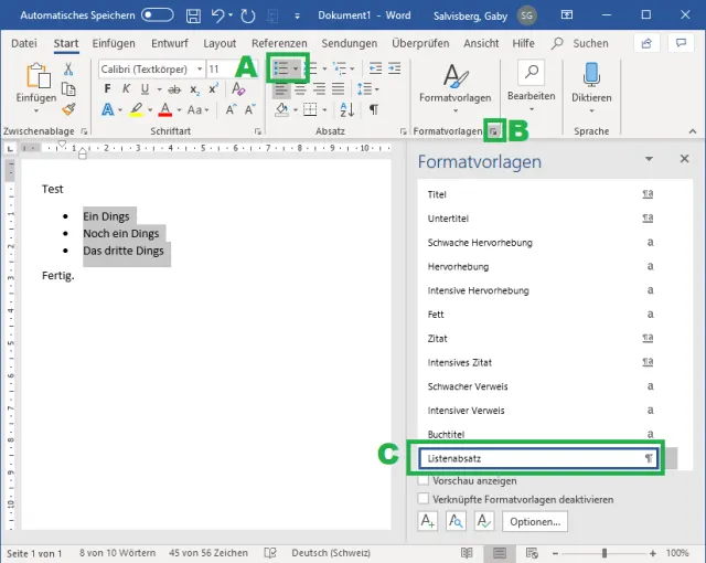 Sobald eine Aufzählung vorhanden ist, finden Sie in den Formatvorlagen auch den Listenabsatz (C). Lassen Sie den aber zunächst, wie er ist.