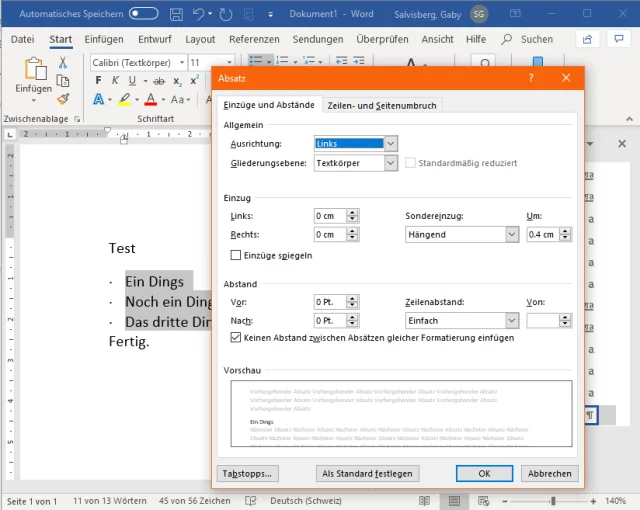 Gestalten Sie jetzt die Aufzählung exakt so, wie sie Ihnen gefällt. Markieren Sie hierfür Ihre Aufzählung und gehen Sie via Aufzählung zu Neues Aufzählungszeichen definieren. Via Symbol wählen Sie ein anderes aus, zum Beispiel ein kleineres, und klicken Sie auf OK. Via Absatzformatierung ändern Sie den linken Einzug vielleicht auf 0 (Null), setzen den Sondereinzug auf «Hängend» von 4 Millimetern und pflanzen bei 4 Millimetern (0.4 cm) auch einen Tabstopp hin. Vielleicht ändern Sie den Zeilenabstand auch gleich auf Einfach.