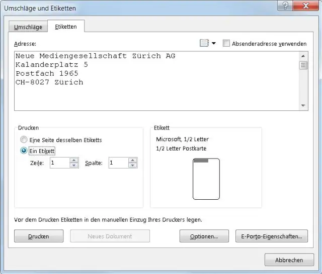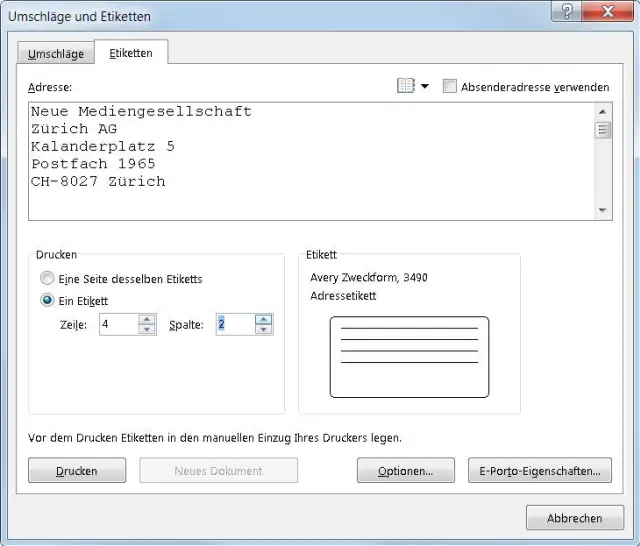 Teilen Sie Word mit, auf welches Etikett es die Adresse drucken soll