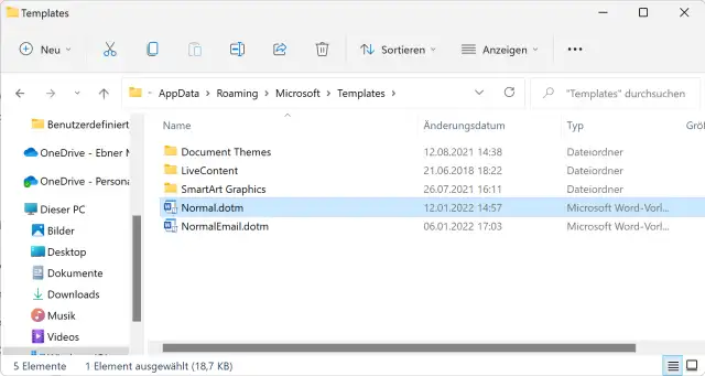 Damit landen Sie in einem Ordner wie C:\Users\IhrName\AppData\Roaming\Microsoft\Templates. Löschen Sie die Datei Normal.dotx, Normal.dotm oder gar Normal.dot (letzteres wäre ein ganz altes Dateiformat). Das erledigen Sie einfach per Klick darauf, gefolgt von der Delete-Taste oder via Rechtsklick und Löschen.