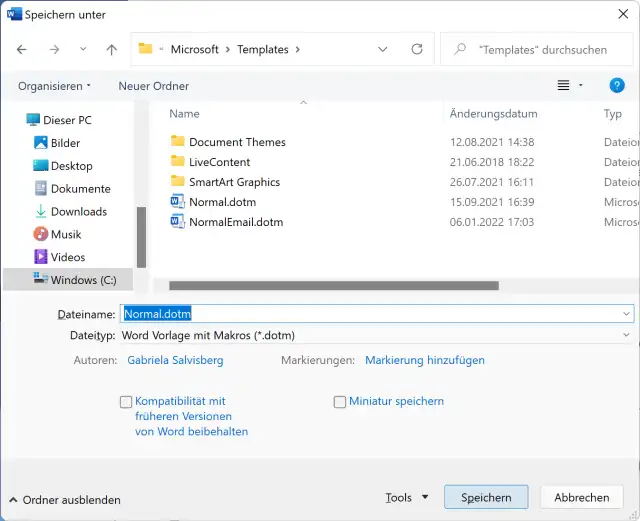 Wenn Word beim Starten keine Datei Normal.dotx oder Normal.dotm findet, dann erstellt es selber eine. Und diese ist üblicherweise im passenden neusten Dateiformat.Speichern Sie Ihre Word-Dateien und Beenden Sie Word komplett. Öffnen Sie z.B. mit Windowstaste+E den Datei-Explorer. Tippen Sie in der Adresszeile Folgendes ein und drücken Sie Enter: %appdata%\Microsoft\Templates