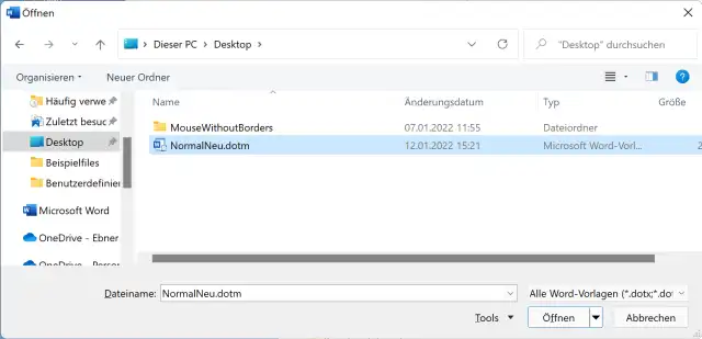 Starten Sie Word. Gehen Sie zu Datei/Öffnen/Durchsuchen. Navigieren Sie zum Desktop und schalten Sie unten rechts die Dateitypen auf Alle Word-Vorlagen (oder auf Word-Vorlagen mit Makros .dotm) um. Klicken Sie auf Ihre NormalNeu.dotm und auf Öffnen.