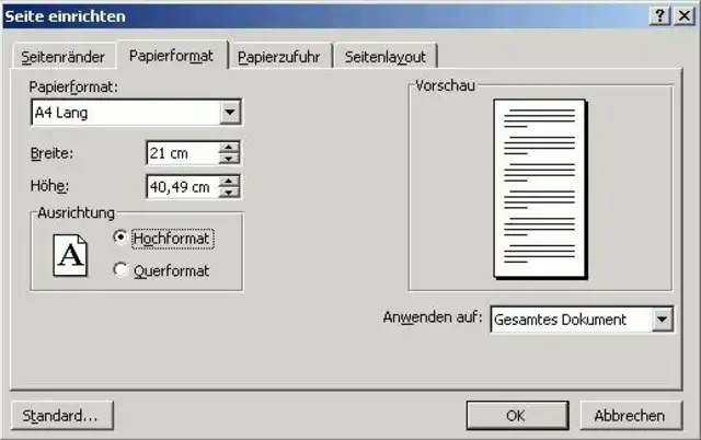 Sofern Sie das Format nicht in der Liste finden, wählen Sie "Benutzerdefiniertes Format" und geben dort die Höhe und die Breite von "A4 lang" ein.