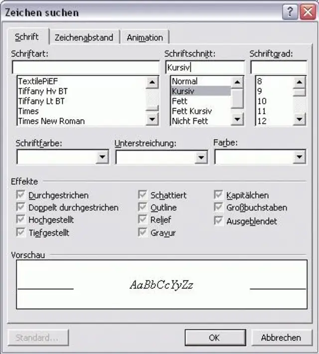 Es erscheint das bekannte Fenster der Zeichenformatierung. Dort wählen Sie den Schriftschnitt "Kursiv".