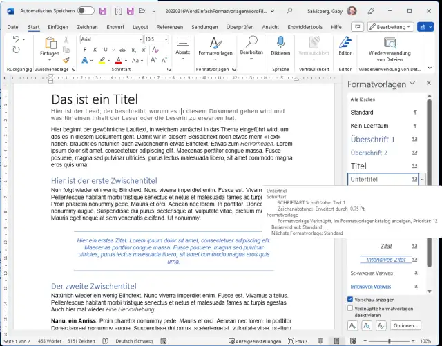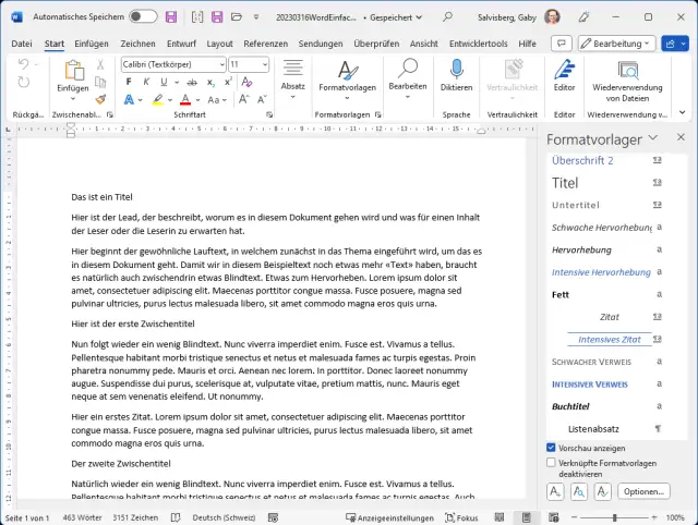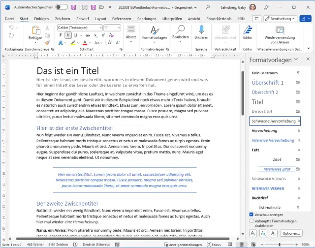 In einem Dokument verwenden Sie nebst gewöhnlichem Lauftext auch einen Titel, Zwischentitel und verschiedene Hervorhebungen wie Anrisse oder Zitate. Viele Word-Anwenderinnen und -Anwender weisen diesen Elementen noch immer direkte Formatierungen zu. So benutzen Sie für den Haupttitel vielleicht eine Schriftgrösse von 24 und fett, für Zwischentitel womöglich Grösse 16 und fett sowie kursiv, für Zitatabsätze eine spezielle Einrückung und so weiter.
