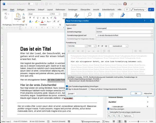 Vielleicht stellen Sie fest, dass für einen bestimmten Zweck ein Format fehlt, für das Sie keins der vorhandenen verwenden wollen. Wir möchten beispielsweise ein Zeichenformat mit Festbreitenschrift für Code-Eingaben. Klicken Sie unter den Formatvorlagen aufs A+-Symbol für Format hinzufügen. Benennen Sie das Format aussagekräftig. Wählen Sie, ob es sich um ein Zeichen- oder Absatzformat handeln soll. Legen Sie die gewünschten Einstellungen für Ihr Spezialformat fest und klicken Sie auf OK.