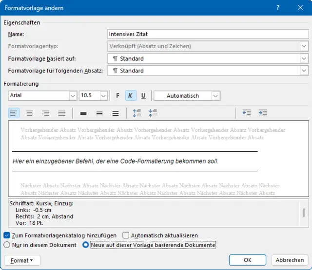 Wählen Sie bei jeder Ihrer Formatvorlagen einmal «Neue auf dieser Vorlage basierende Dokumente»