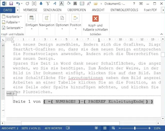 Wechseln Sie zur ersten Seite, die nummeriert werden soll. Klicken Sie auf dieser doppelt in die Fusszeile und entfernen Sie vorerst das Feld mit der falschen automatischen Gesamtseitenzahl. Fügen Sie stattdessen ein eigenes Formelfeld ein. Das geht wie folgt: