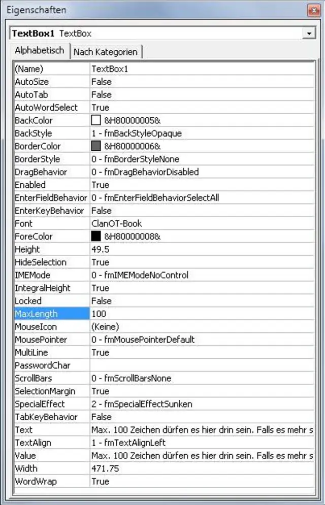 Quelle: PCtipp.chKlicken Sie das Textfeld an und gehen unter «Steuerelemente» zu den Eigenschaften. Word zeigt jetzt ein auf den ersten Blick kompliziert aussehendes Fenster an. Die von Ihnen gesuchte Einstellung für die maximale Zeichenzahl heisst «MaxLength». Tippen Sie da einfach die gewünschte Anzahl Zeichen ein, zum Beispiel 100. Interessant sind hier für Sie sicher auch die folgenden Einstellungen: Neben «Font» wählen Sie die gewünschte Schriftart und bei «MultiLine» schalten Sie per «True» auf eine mehrzeilige Darstellung im Textfeld um.