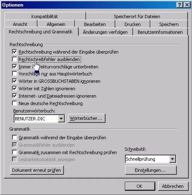 Word: Rechtschreibfehler ausblenden/anzeigen