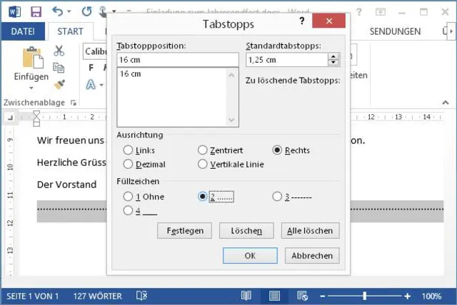 Quelle: PCtipp.chSetzen Sie den Cursor in die Zeile, in der die Abtrennlinie erscheinen soll und klicken Sie irgendwo gegen Ende ins Zeilenlineal hinein. Dort erscheint das Winkel-Symbol für den rechten Tabstopp. Ziehen Sie ihn per Maus möglichst genau auf die Markierung, die im Zeilenlineal die Zeilenlänge bezeichnet. Drücken Sie nun in der Zeile einmal die Tab-Taste, um einen Tabsprung einzufügen. Der Cursor springt zwar jetzt an den rechten Seitenrand, aber da fehlt noch eine Linie. Markieren Sie die Zeile, rufen Sie nach einem Rechtsklick darauf den Punkt Absatz auf und klicken Sie auf die Schaltfläche Tabstopps. Unten entdecken Sie schon die Füllzeichen. Klicken Sie zum Beispiel die zweite Option (Punktlinie) an und klicken Sie auf OK. Die Linie erscheint.