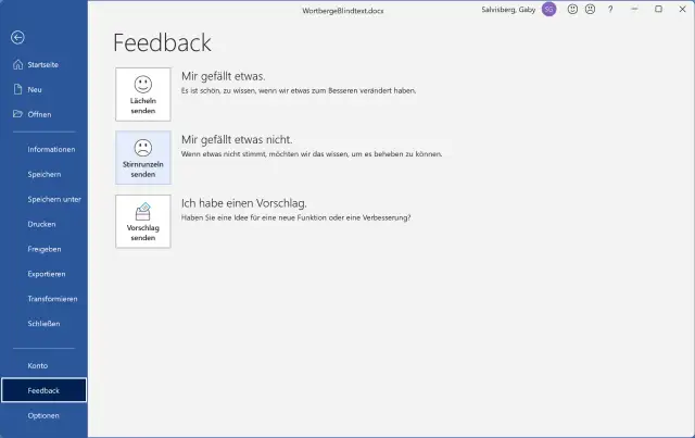 Gehen Sie in Word zum Menü Datei und klicken Sie in der linken Spalte auf Feedback. Benutzen Sie das traurige Stirnrunzeln senden-Smily für «Mir gefällt etwas nicht».