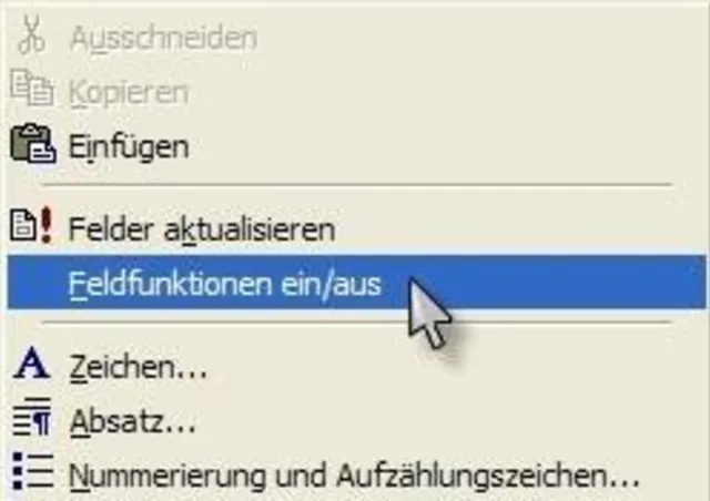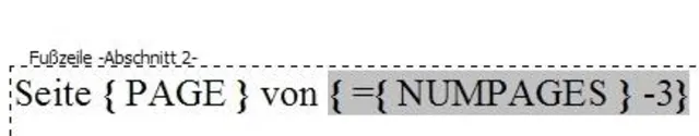 Über das Fusszeilenmenü fügen Sie in Abschnitt 2 «Seite X von Y» ein, auch dort steht nun «Seite 1 von 4». Wenn die ersten drei Seiten nicht mitgezählt werden sollen, müssen Sie die Gesamtseitenzahl nun für die Anzeige noch ändern. Dazu lassen Sie sich die Feldfunktionen anzeigen. Klicken Sie mit der rechten Maustaste auf das eingefügte Feld mit "Seite 1 von 4" und wählen Sie aus dem Kontextmenü "Feldfunktionen ein/aus".