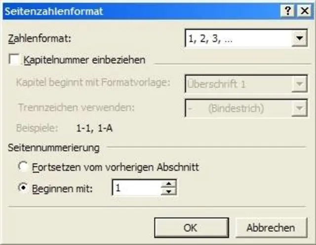 Quelle: PCtipp.chKlicken Sie auf die Schaltfläche Format. Hier nun können Sie einstellen, dass Sie die Nummerierung mit «1» beginnen wollen. Bestätigen Sie die Eingabe mit OK.