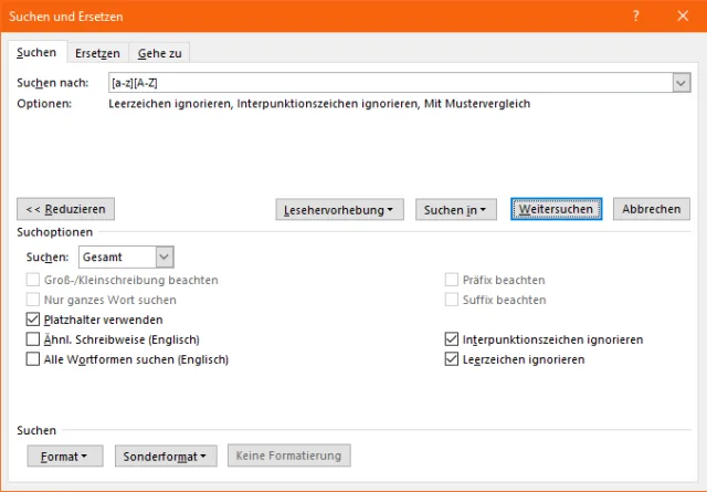Öffnen Sie das Dokument und setzen Sie mit Ctrl+Home (Strg+Pos1) den Cursor ganz an den Anfang. Gehen Sie im Reiter Start zu Suchen/Erweiterte Suche. Aktivieren Sie mindestens Platzhalter verwenden, allenfalls auch Interpunktionszeichen ignorieren und Leerzeichen ignorieren.