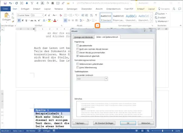 «Seitenumbruch oberhalb»: Klicken Sie in die erste Zeile der Tabelle, das dürfte jene mit den Spaltentiteln sein. Öffnen Sie im Reiter Start im Bereich Absatz über das unscheinbare Symbol die Absatzeinstellungen. Wechseln Sie zu Zeilen- und Seitenumbruch. Entfernen Sie alle anderen Häkchen, aktivieren Sie aber Seitenumbruch oberhalb und klicken Sie auf OK. Damit wird ein Seitenumbruch eingefügt, was dafür sorgt, dass die Tabelle komplett auf die nächste Seite zu liegen kommt. Das Problem bei dieser Lösung ist jedoch, dass Word die Tabelle damit immer auf die Folgeseite platziert, auch wenn sie auf einer angefangenen Seite mit wenig Text noch Platz hätte.