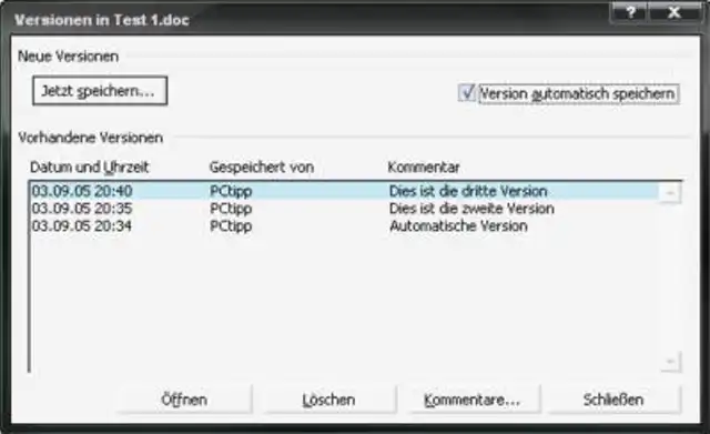 Die neueste Version befindet sich zuoberst. Markieren Sie die gewünschte Version und klicken Sie auf "Öffnen", wenn Sie diese Version wieder laden wollen. Klicken Sie auf "Löschen", wenn sie die markierte Version löschen wollen. Über die Schaltfläche "Kommentare..." können Sie eine Beschreibung der jeweiligen Version eingeben. Wird die Version automatisch beim Schliessen des Dokumentes gespeichert, lautet der eingetragene Kommentar "Automatische Version".