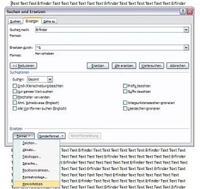 Klicken Sie auf die Schaltfläche "Erweitern", so dass weitere Optionen des Suchen-und-Ersetzen-Dialogs angezeigt werden. Dort wählen Sie unter "Format" die Option "Hervorheben" aus.